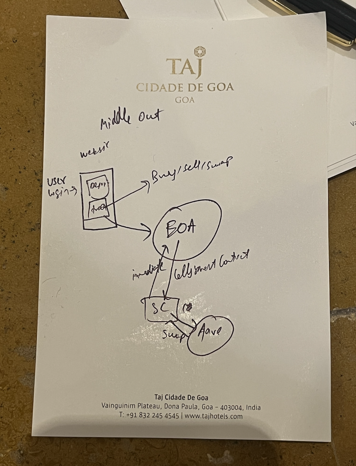 "user goes to our website, and he makes a normal fiat transaction, which is he deposits 1000$ to our bank account. (the user never touches the chain, all his things are secured with a username password). The moment he does this, we buy USDC on our externall owned account (MEOA (Mony EOA lol)) Then this money stays there in the EOA (Reason for this MEOA is that an EOA is needed to call a smart contract) then we provide the users with a trade button, where they have three options: buy/sell/swap (simplistic for now) Whenever the user calls an option (like say i think ETH is going to go uppp, this is what traders speculate like),so like he says to swap 100 USDC of their with ETH (10 eth say); what we'll do is we'll relay this information to the MEOA via normal backend. Then this EOA will call our smart contract (Mony Smart Contract) and tell it to do the swapping with AAVE. (what is the reason we even need a SC here? think of some good reasons, like i want to have one cos else it looks tooo decantrlised, this way atleast there's some crypto. i guess smart contracts can deal with AAVE easily?) The smart contract will do the swap and immediately send the eth it gets back to the EOA ( no point in storing it in the SC right?)