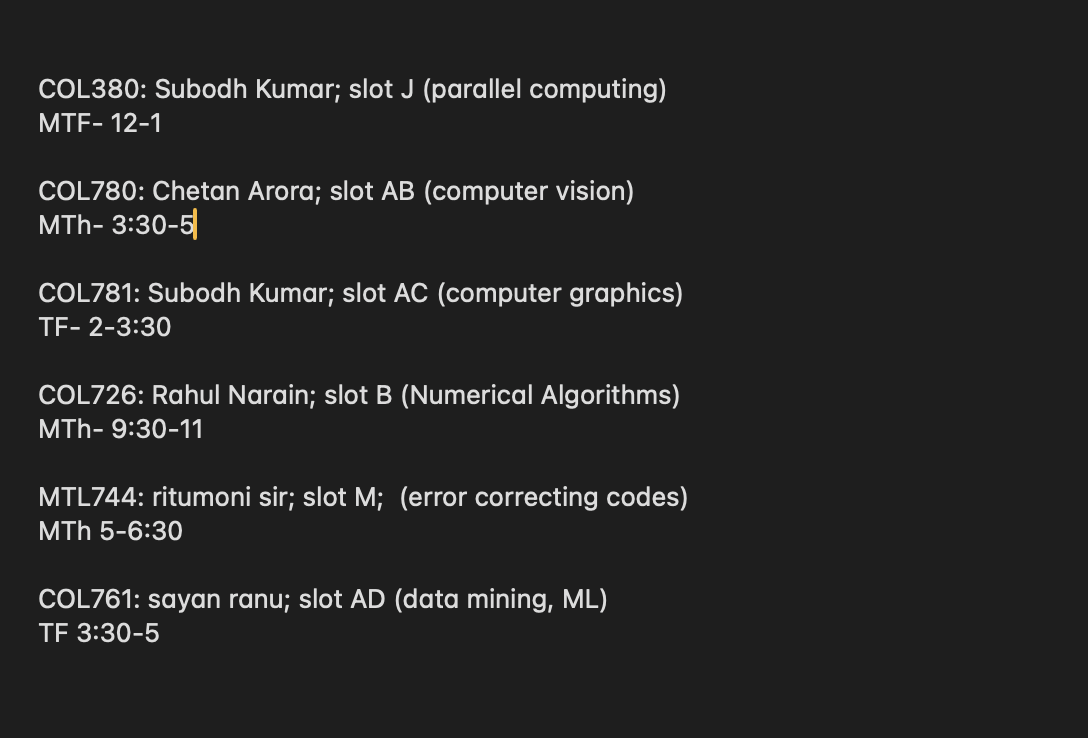 I want really difficult courses, shit ive never done before, and things that are genuinely difficult, so i guess that means more CS than math, cos all the math courses are boring and trivial as fuck for me... cos like genuinely if something is not difficult or entertaining for me, ill have -ve motivation for it, and miss exams assignments everything lmao. and also, things that are not in my immediate plan to do. like last sem, with probability and AI, these are things i wanna learn myself using the mony method, so i did not wanna ruin my learning of these concepts by the retard college route. also having a cool prof helps. so yuh, lets check this shit out now: