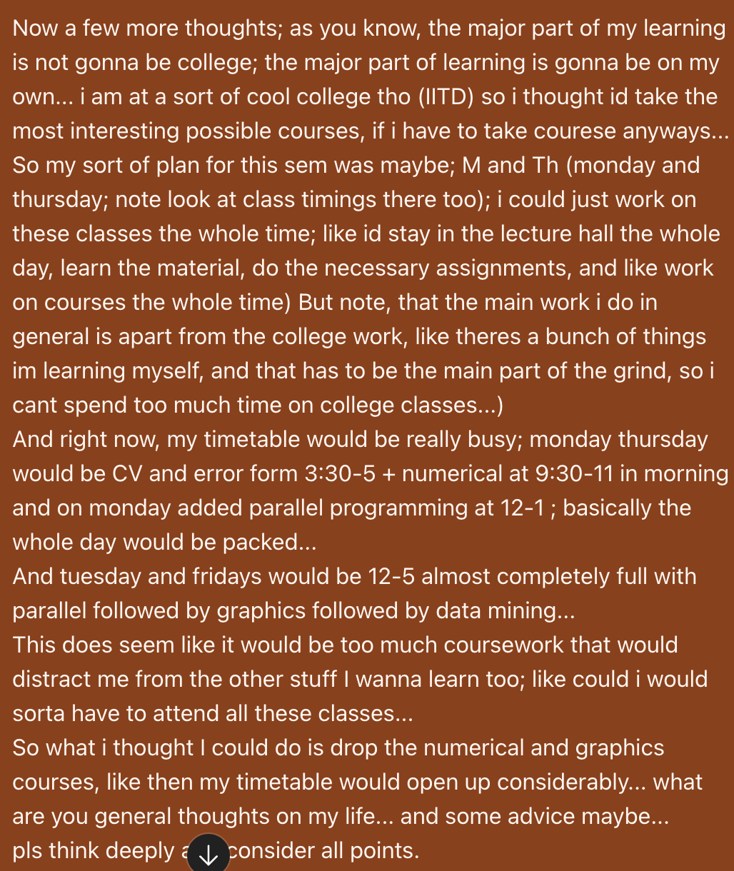 "ok perfect. so i have decided to take parallel cos like i really wanted a deep cs course... now my choice for the last course is between numerical, ML and graphics... i have like sort of two vectors now, 1) interesting ; like how interesting the course is to me... 2) useful, like how useful the course will be to me so now let me rate them one by one, on my current thoughts: DATA MINING: first off, the prof is the coolest here, like hes actually accomplished and fun... secondly, this does seem like it would be very like useful adn itnersting stuff, but the thing is, ill have to treat this as just a course and not think too deeply about this; cos i will do my whole fundamental ai journey ala mony method soon; so i dont wanna ruin that learning. but i think it could be useful to sort of know a bunch of cool ml things via this course. only downsides are; i dont want the ceilings of this course to interfere with my learning (big worry) GRAPHICS: this is like going to be really interesting i think. this is also going to be completely useless i think. am i going to learn *anything* in this course that might be useful to me in the future? cos i dont think i am going to be working in the computer graphics space... i guess i will learn a bunch of cool math, cs, that i normally wouldnt. i could build a few cool vr/ar stuff maybe? NUMERICAL: this is not going to be itneresting to me at all. tihs is however going to be one of the more useful courses; because ill learn a bunch of skills. also this wont interfere with my learning at all. and the timing is convenient... so now; give me your detailed thoughts. answer all my questions. critique me where my reasoning is wrong; and reinforce where i am right... give me your thoughts like a friend/mentor. think hard and deeply"